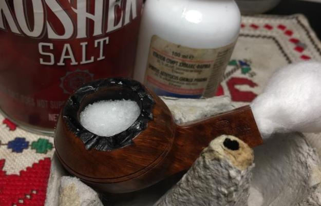 With my day ending, I continue cleaning the internals of the stummel. I use a kosher salt and alcohol soak. I fashion a wick by stretching and twisting a cotton ball. I insert the ‘wick’ down the mortise into the airway. I then fill the chamber with Kosher salt which, unlike iodized salt, leaves no aftertaste. I then situate the stummel in an egg crate giving it stability and then add isopropyl 95% with a large eye dropper until it surfaces over the salt. After a few minutes I top the alcohol once again and then turn out the lights.