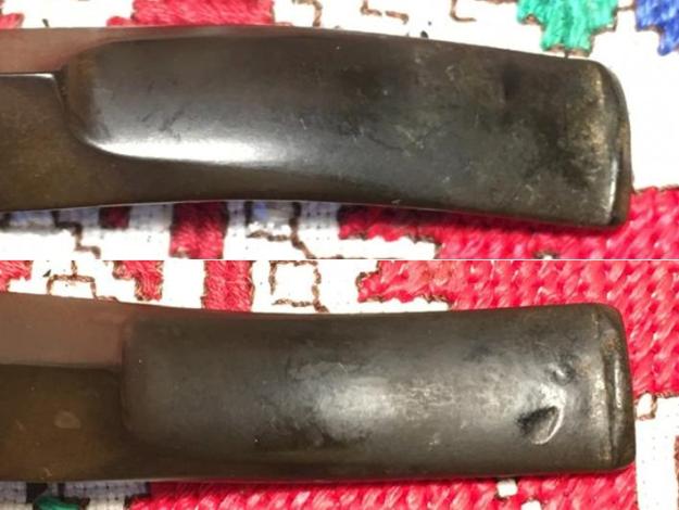 I continue the smoothing and erasing of the 240 scratches by using 600 grade paper and then finishing with 0000 grade steel wool. The patches look good, oxidation seems to be abated and the button shaping will be greatly appreciated by a new steward!