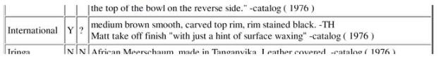 I was excited to get a lead on what appears to be a GBD pipe line of “carved top rims” that were stained black. The reference in the second line is to a 1976 catalog where I could hopefully find more about the International line. Hopeful of finding this catalog, I went to the internet. Unfortunately, I could find nothing. Also disheartening, the usual go to page for catalogs, Chris’ Pipe Pages, I discovered some time ago, now seems to be defunct. Sad. So, again I sent Al a note with some questions. His reply came very quickly with this picture of at least one ‘GBD International’ from the 1977 Tinderbox catalog. The writing is not easy to make out but the “M.” example of the International line is a nice looking oval shank Volcano shape which I can make out has a carved rim like the Bulldog. With this information, my thinking is that the GBD Bulldog I have is dated from 1976 but earlier than 1981. Again, much thanks to Al Jones!