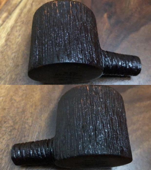 I reunite stem and stummel and mount a cotton cloth buffing wheel to the Dremel, setting the speed at the slowest. I then apply Blue Diamond compound to the entire pipe. I also work on blending the black matte plateaued rim. What I discover regarding the rim is that when I simply buff it with the Blue Diamond compound, is shines it up! The exact opposite than dulling it down to a matte, charcoal look. Then I came up with the idea of simply wetting a cotton pad with alcohol and dabbing it over the rim to dull the finish. It worked like I was hoping. I take a picture of before and after. It’s difficult to see different shades of black in a photo! But it does look good – the effect is striking.