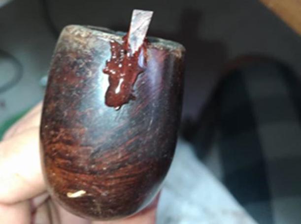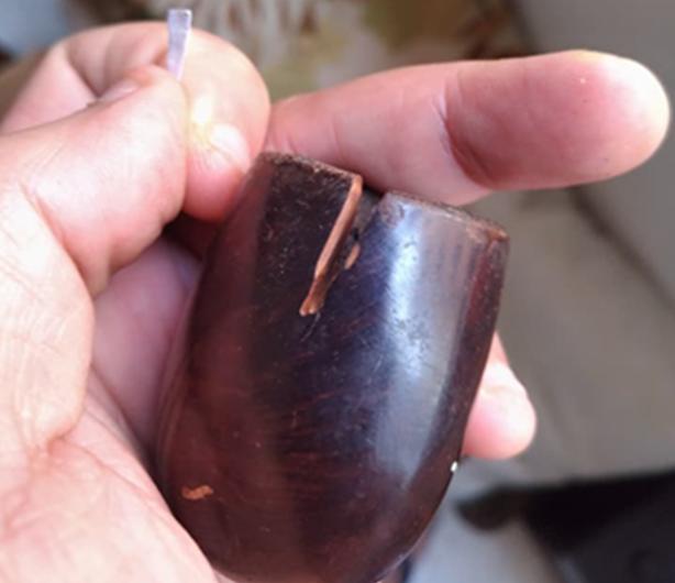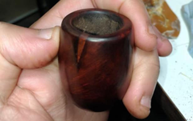 I take a picture of the chamber and see that there is very little cake build up, but I also see that it appears someone took a pocket knife to the chamber in the past – with little care. I take the Savinelli Fitsall Tool and I ream the bowl of residue carbon. Following this, I sand the chamber with 240 grit paper by wrapping the paper around a Sharpie Pen seeking to clean it but also to smooth the top of the chamber where knife marks were. I then clean the chamber with a cotton pad wetted with isopropyl to rid it of carbon dust. The chamber wall seems to be in good shape – no cracks or heat fissures are visible, but I will need to do a bit more sanding – I’ll wait to do this along with the rim repair.