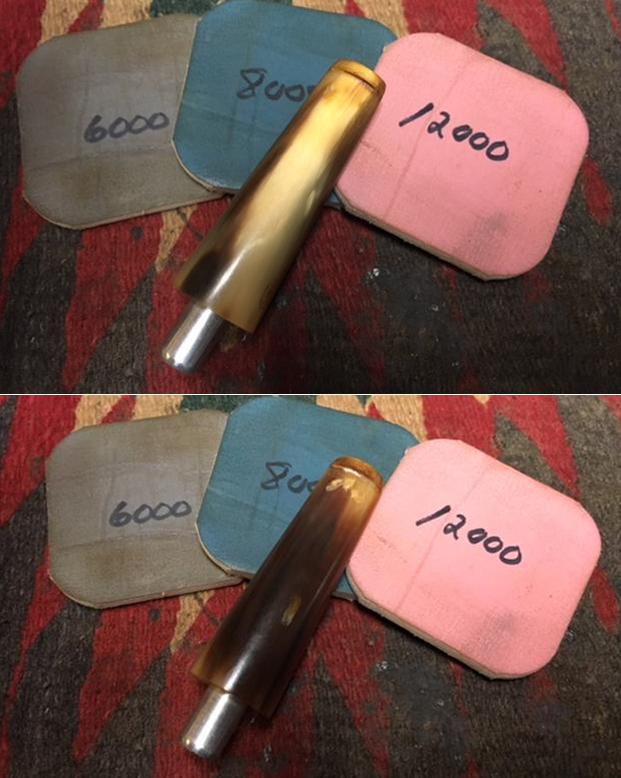 Then, using a flat needle file, I begin filing down the patches to near the briar surface. Then I use 240 grit paper to remove the remaining excess patch material bringing the fill flush with the briar surface. Following the 240 paper, I use 600 grit paper on each of the patch areas. Finally, I return to the initial micromesh pads and sand the patches with 1500 to 2400 grade pads. The detour is complete, back on track. The pictures show the patch repairs. These patches will blend very well.