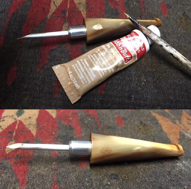 The detour means that I need to apply patches to the pits – I mix briar dust and thick CA glue to form a putty that I apply to the holes. I first use a sharp dental probe to make sure the pits are free of debris. I use an index card to do the mixing by placing some dust in a pile. I then place some of the CA glue next to the briar dust. Using a toothpick, I gradually draw a bit of the dust into the glue while mixing it with the toothpick. I continue to do this until the putty reaches a molasses-like consistency.