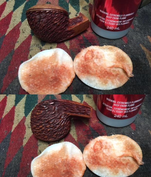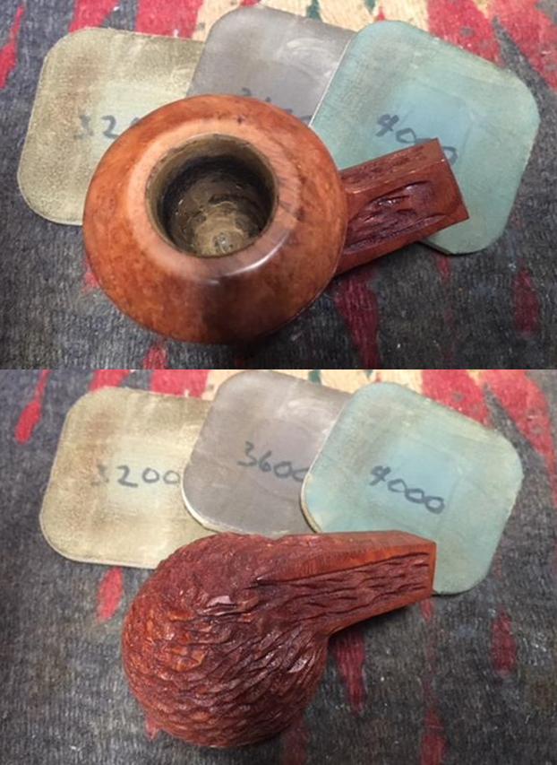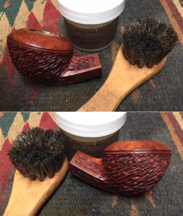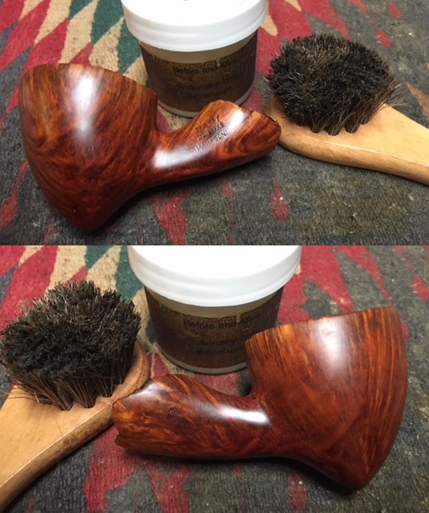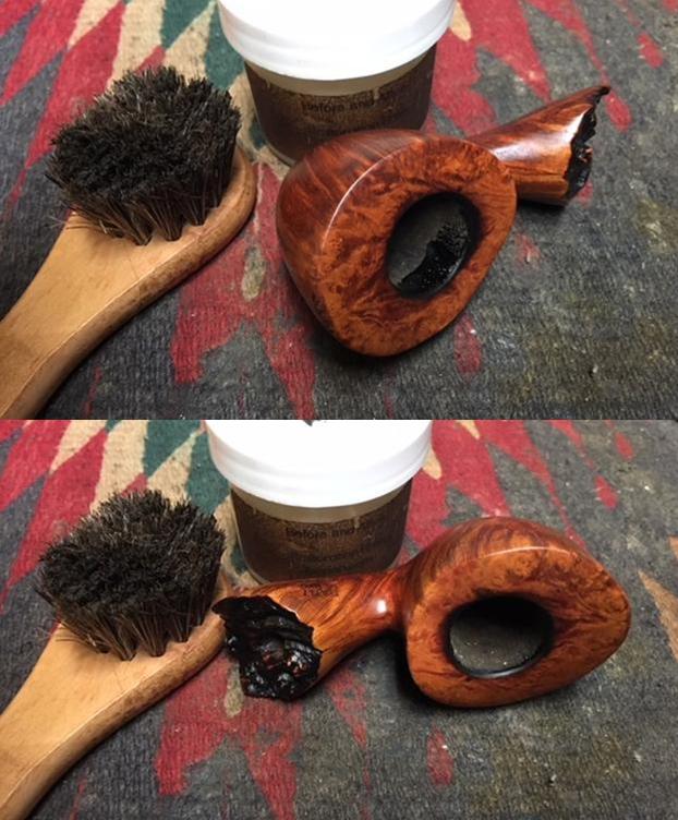I wiped the bowl down with acetone on cotton pads to remove the varnish that remained. I worked it into the grooves of the rustication with a brass bristle wire brush. Once I was finished the finish was clean and the grain looked really good on the cap and the rim top. The rustication was clean.