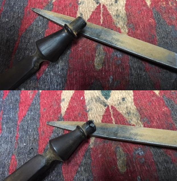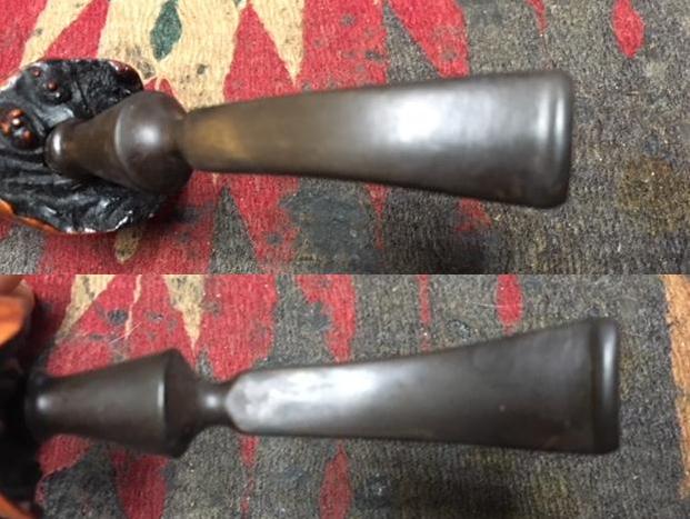 The stamping on the left underside of the diamond shank is clear and readable. The KBB in the cloverleaf has more wear than the rest of the stamping. You can also see the grime on the finish in the photo below. The second photo shows the propeller logo on the top left side of the diamond saddle stem.