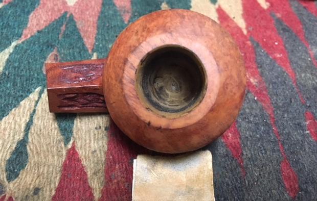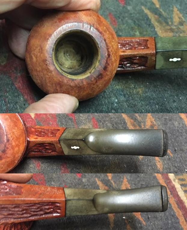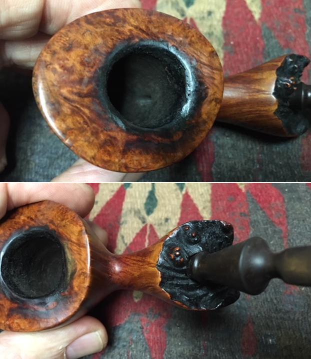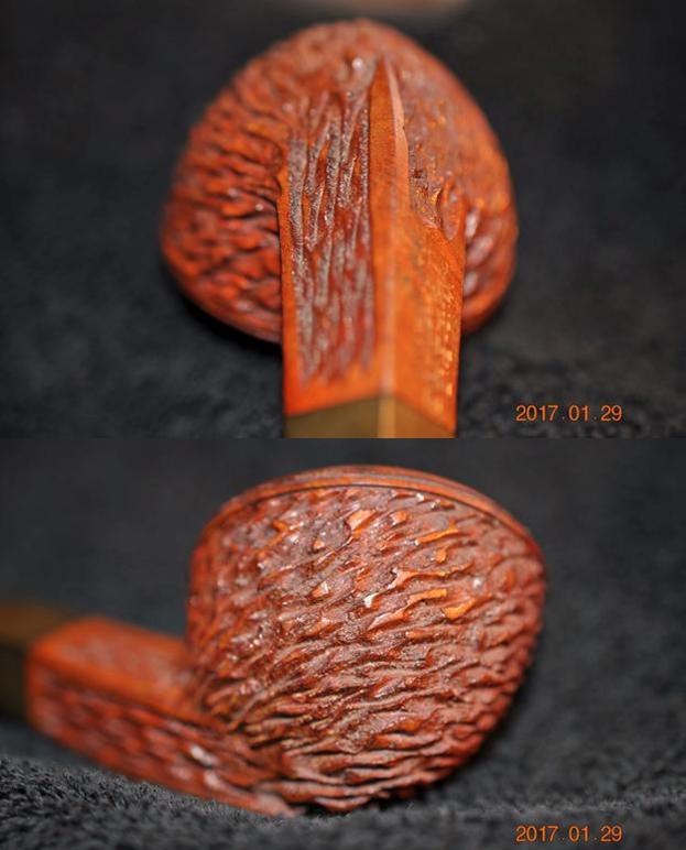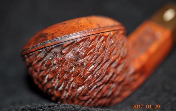 Jeff also took photos of the bowl from various angles to show the condition of the finish. You can see the crackling varnish and dust in the grooves of the rustication. The varnish is worn off the smooth portions and high spots on the rustication. There is also dust and crackling varnish filling in the twin rings that separate the smooth cap from the rusticated lower portion.