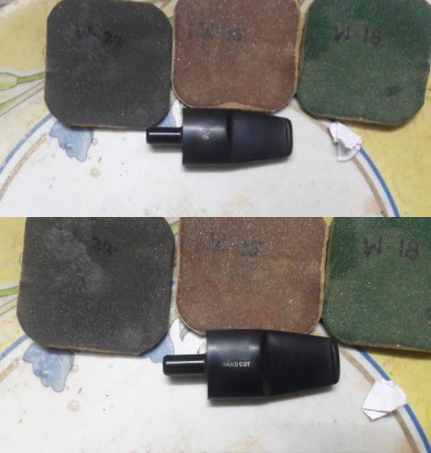 The first step that I usually follow is the reaming of the bowl. Using a Kleen Reem pipe tool and my trusty and effective fabricated knife, Abha, my wife, cleaned out the cake from the chamber. To smooth out the inner surface of the chamber and completely remove the last traces of remaining cake, she sanded the inner surface with a 220 grit sand paper. With a sharp knife, very gently scraped the surface of the rim top and removed the accumulated tars, oils and grime.She cleaned the bowl and rim using undiluted Murphy’s Oil soap and a toothbrush. Thereafter, the bowl was washed under running tap water and immediately dried out using paper towels and a soft cotton cloth.