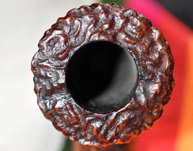The next pipe on the table was one of a pair of Oom Paul pipes that my brother Jeff picked up in from a guy in Texas. This one is full bent Oom Paul with a gnarly rustication on a classic shaped pipe. It has some great grain underneath the rustication on the bowl and shank. It has a contrast stain with dark brown in the grooves and light/medium brown stain that gives the pipe lots depth and dimension. It is stamped on the left side of the shank Siena Artistica. There is no other stamping on the shank or bowl. The finish was in very good condition. The rim top was clean and there was no damage on the inner and outer edges of the bowl. The bowl had a light cake in it that would be easy to deal with. The stem was acrylic and variegated browns and golds. It had some tooth chatter and scratching on both sides near the button. The stem had an acrylic band that was silver and white. Jeff took photos of the pipe before he started his cleanup up work. He took a clear photo of the rim top showing that it was quite clean. There was some buildup and grime in the grooves of the rustication. The edges of the bowl look very good. There is a light cake in the bowl.The stem was in good condition. There was some tooth chatter and scratches on the top and underside near the button.The stamping on shank read Siena Artistica and is very readable and clean.Jeff had scrubbed the exterior of the bowl with Murphy’s Oil soap and removed the dust and grime that had accumulated there. The finish looked very good once it had been scrubbed. He lightly reamed the bowl with a Savinelli Fitsall Pipe Knife. He cleaned the interior of the mortise and the airway in the shank and the stem with alcohol, cotton swabs and pipe cleaners. The pipe came to me clean and ready to do the restoration. I took some photos of the pipe to show the condition at this point in the process. I took some photos of the rim top and sides of the bowl to show the condition of the surface of the rim. There is some darkening on the inner edge of the bowl. I also took close up photos of the stem to show its condition. There is some light tooth chatter and tooth marks on both sides near the button but otherwise it is in good condition.I rubbed the bowl down with Before & After Restoration Balm to deep clean the briar bowl and the rim top as well as the briar shank. The product works to clean, enliven and protect the briar. I hand rubbed it with my fingers, working it into the exterior of the pipe. I used a horsehair shoe brush to get the product deep in the whirls and swirls of the rustication. After it had been sitting for a little while, I buffed it with a soft cloth to polish it. The pipe really began to have a rich shine. I took some photos of the bowl at this point to mark the progress in the restoration. I set the bowl aside and turned my attention to the stem. I used a folded piece of 220 grit sandpaper to sand out the tooth chatter and marks on both sides of the stem just ahead of the button. They were not deep so it did not take tooth much to remove them.I polished the stem with micromesh sanding pads – wet sanding with 1500-2400 grit pads and dry sanding with 3200-12000 grit pads. I wiped the stem down after each pad with Obsidian Oil to remove the sanding dust on the vulcanite. I finished the polishing process with Before & After Pipe Stem Polish – both Fine and Extra Fine. When I finished polishing and wiping it down I set it aside to dry. I polished stem and bowl with Blue Diamond to polish out the remaining small scratches. I gave the bowl multiple coats of Conservator’s Wax by hand and the stem multiple coats of carnauba wax. I buffed the pipe with a clean buffing pad to raise the shine. I hand buffed it with a microfiber cloth to deepen the shine. The pipe polished up pretty nicely. The contrasting dark and light brown stains on the unique rustication with the polished, brown/gold variegated acrylic stem worked together to give the pipe a unique look. The finished pipe is shown in the photos below. This is a beautiful rusticated Oom Paul with a unique finish that has already found a new home. The shape, finish and flow of the pipe and stem are very well done. The dimensions are Length: 5 3/4 inches, Height: 2 1/2 inches, Outside diameter of the bowl: 1 3/4 inches, Chamber diameter: 3/4 inches. This one will be on its way to the southern states of the US once I finish the second Oom Paul I am working. The pair already has a new home. Thanks for walking through the restoration with me as I worked over this unique Oom Paul.