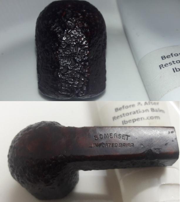 Once I was satisfied with the stem and rim top restoration, I started work on the stummel which has dried by now. I rub a small quantity of “Before and After Restoration Balm” in to briar and let it rest for a few minutes. The balm almost immediately works its magic and the briar now has a nice vibrant appearance. I further buff it with a horse hair shoe brush.