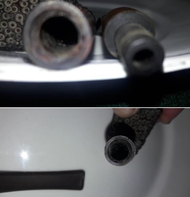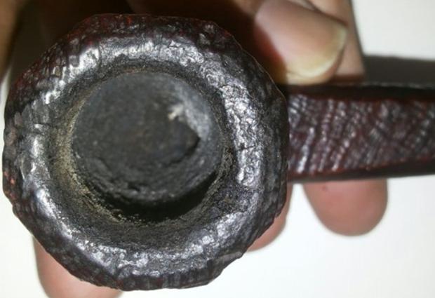 The bowl is narrow and tapers down towards the draught hole. The chamber is so filled with cake that I am unable to reach the bottom of the bowl with my little finger. The build-up of the cake is more heavy in the bottom half of the bowl. The mortise is full of oils and gunk and air flow is restricted. The rim top is smooth and the grains are accentuated with a lighter stain, which can be seen through the overflowing lava. The inner and outer edge of the rim is in pristine condition with no dings or dents.