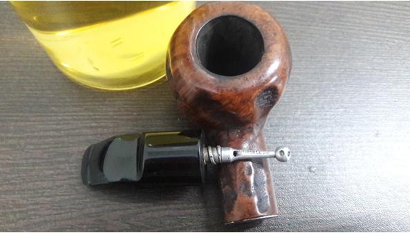 The next thing to address was the blocked stem. I tried cleaning the airway in the stem with pipe cleaners dipped in alcohol, but the pipe cleaner would not go in the complete distance. There was gunk and tars which had accumulated inside the airway and in the holes too!!!! Using a straightened paper clip, I probed and cleaned all the holes on the stinger. I tried to blow through the stem, but I realized that it was still blocked. I tried pushing the paper clip through the airway and then there was this small sound of a crack!!!!!! Aargh……..the upper lip now has a chip!!!!! Undaunted by this temporary setback, I continue with the clearing of the blocked stem. Finally, I am able to dislodge the block and now the air flows freely through the stem.