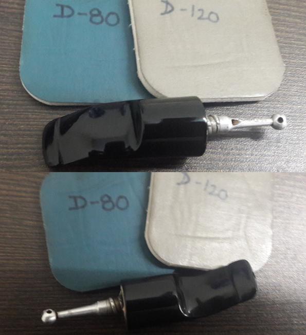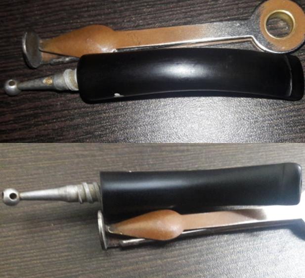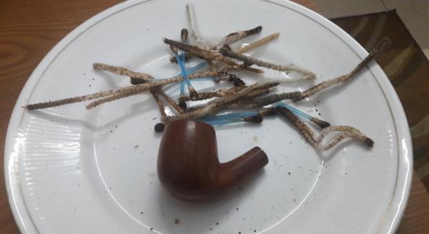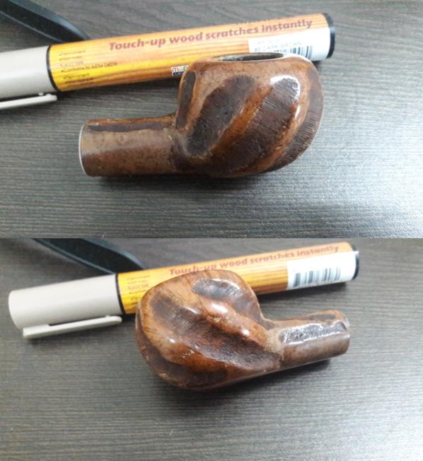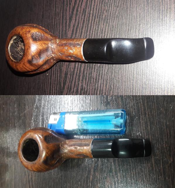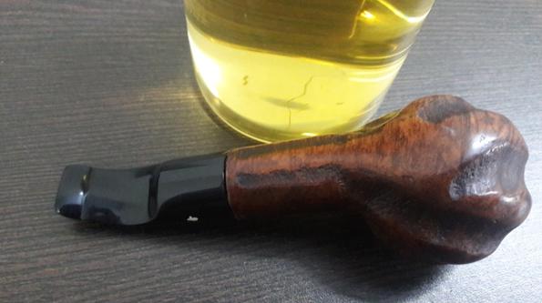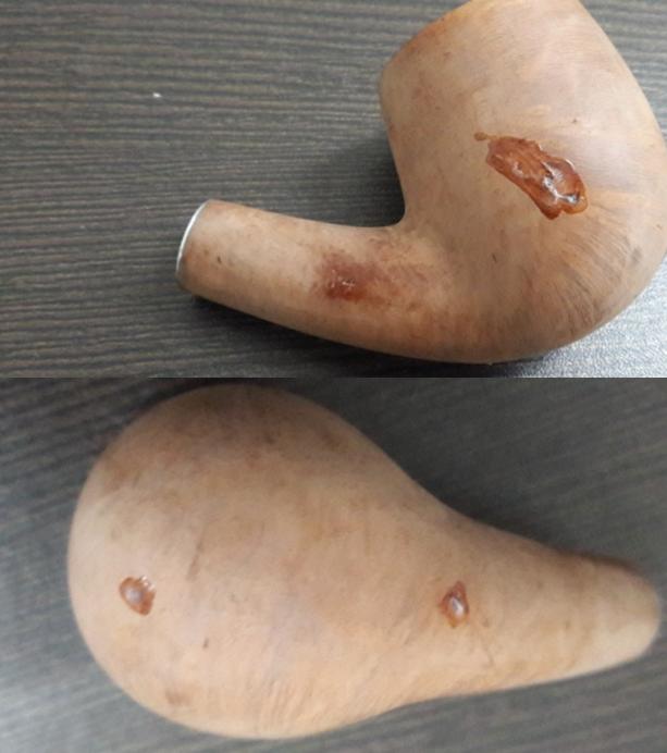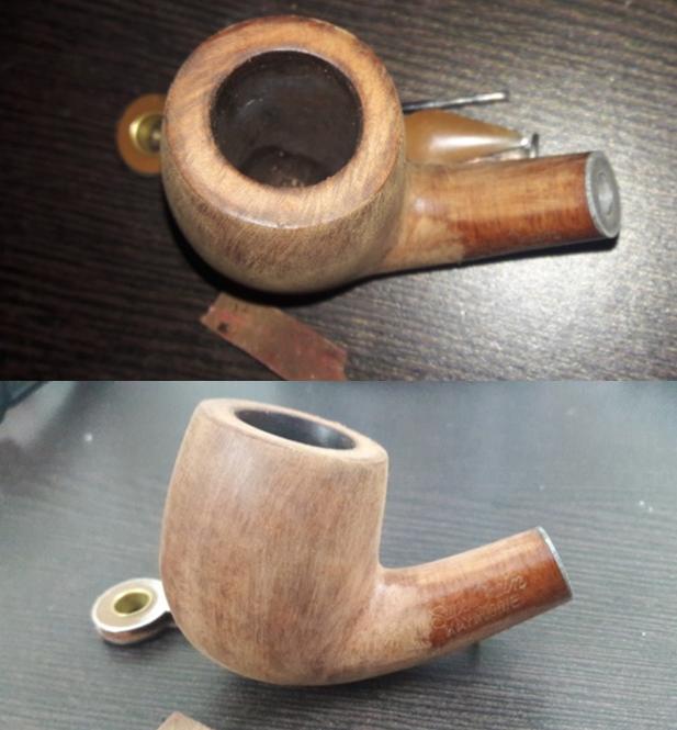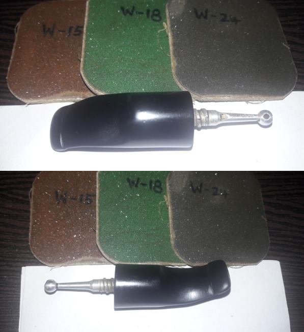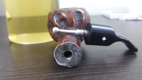 The next thing to address was the blocked stem. I tried cleaning the airway in the stem with pipe cleaners dipped in alcohol, but the pipe cleaner would not go in the complete distance. There was gunk and tars which had accumulated inside the airway and in the holes too!!!! Using a straightened paper clip, I probed and cleaned all the holes on the stinger. I tried to blow through the stem, but I realized that it was still blocked. I tried pushing the paper clip through the airway and then there was this small sound of a crack!!!!!! Aargh……..the upper lip now has a chip!!!!! Undaunted by this temporary setback, I continue with the clearing of the blocked stem. Finally, I am able to dislodge the block and now the air flows freely through the stem.