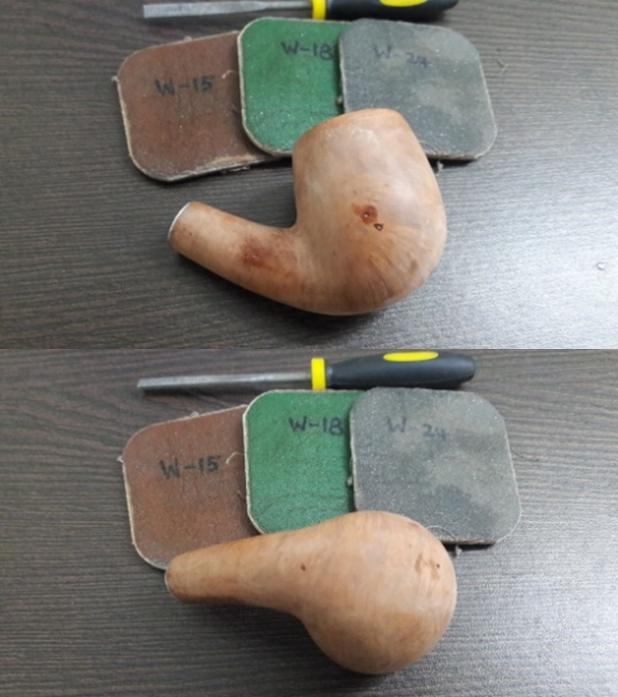 First and foremost in any restoration of pipe, I start with reaming the chamber with a Kleen Reem pipe reamer. However, in this instance, the cake was dry, tightly packed and very hard. I feared breaking the reamer and resorted to the use of my fabricated knife. After a struggle, I was able to take the cake down to the bare briar. I sanded the inner walls of the chamber with 150, 220 and 600 grit sand paper to completely remove the remaining cake and smooth out the walls. Alas, I observed some superficial gouges on the wall surface due to the use of knife. I would need to address this by coating the chamber walls with pipe mud at a later stage. I cleaned the mortise and internals of the shank with cue tips, pipe cleaners and alcohol.