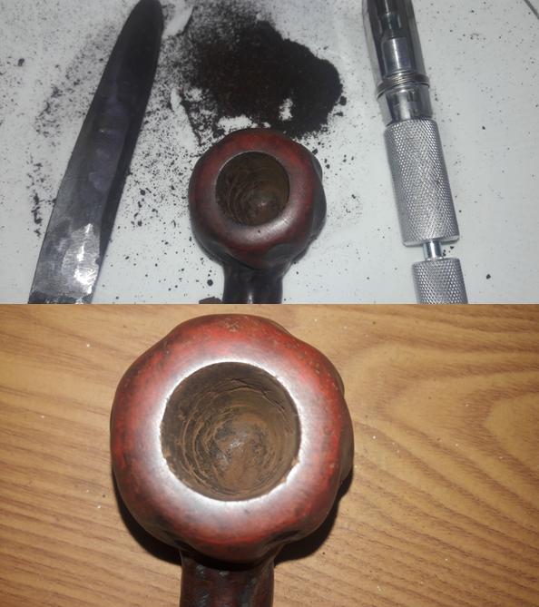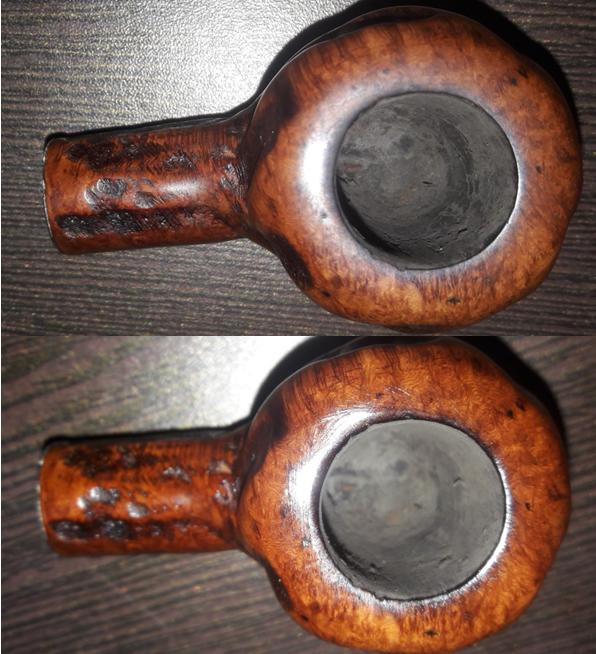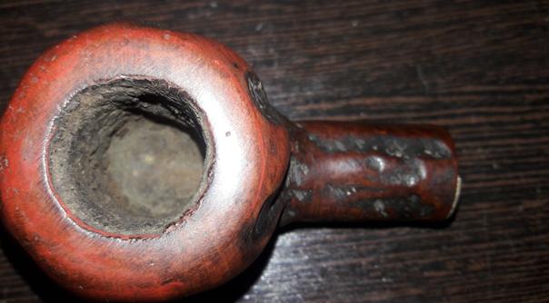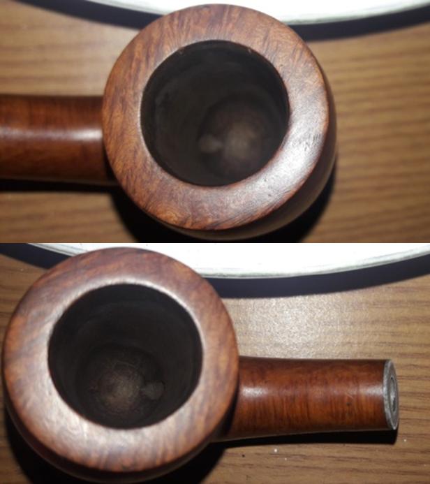 There is a decent layer of cake inside the bowl which is dry and hard to the touch. The smooth rim top is clean and devoid of any apparent damage. The condition of the inner walls of the chamber can be ascertained after the cake has been reamed out. The inner edge of the rim shows minor uneven surface, however, the outer edge of the rim is clean and without dents or dings.