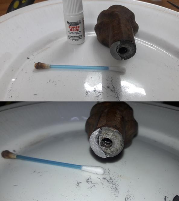 (a) Coat the entire spacer, including the broken portion, with superglue, building it up in layers and then sanding it to flatten it on a topping board. This coat of superglue will also stabilize the remaining original spacer.