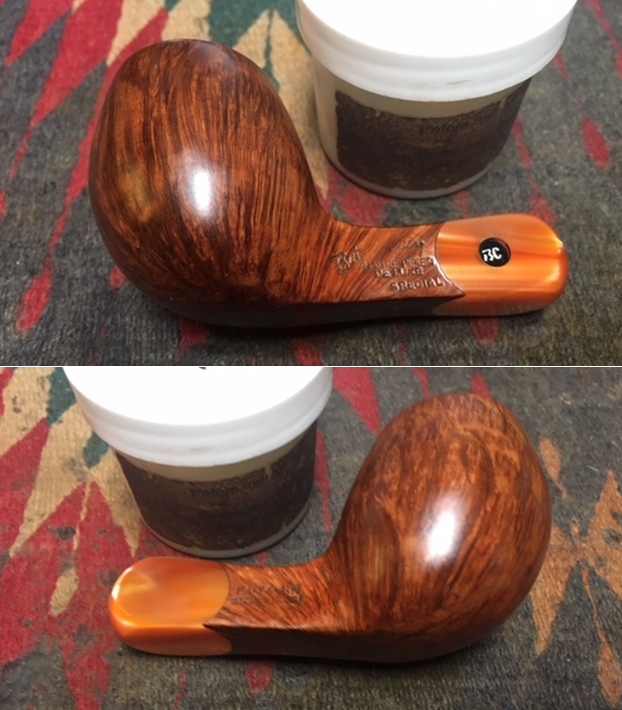 To enrich the natural grain of the bowl, I apply Before & After Restoration Balm. I apply some Balm on my fingers and work it into the briar surface. The Balm starts with a thinner oil-like viscosity then gradually thickens to a waxy consistency. After I apply the Balm thoroughly, I let the bowl stand for several minutes while the Balm absorbs. I then wipe off the Balm using a microfiber cloth and gradually, as the Balm is removed, I transition to buffing with the cloth. I take a picture while the Balm is doing its thing and after. I’m liking it a lot!