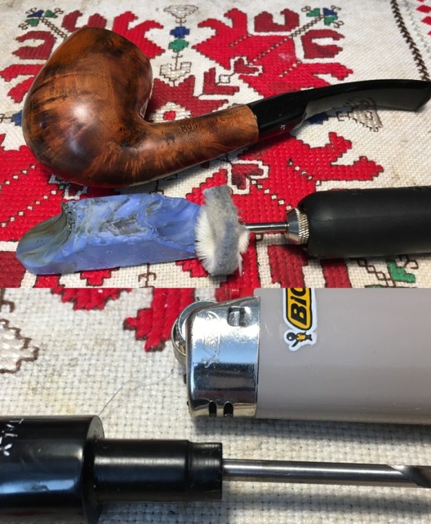 I now reunite the stem and the bowl and mount a cotton cloth buffing wheel to the Dremel. I set the speed at about 40% full power and apply Blue Diamond compound to the entire pipe. Afterwards, I wipe/buff the pipe with a felt cloth to clear it of leftover compound dust. While I was buffing with the felt cloth, I note that the stem fitting is a little loose for my liking. This sometimes happens after cleaning the pipe well and scraping the mortise. To remedy this, I fit a drill bit just larger than the airway diameter and heat the tenon with a Bic lighter. As the vulcanite tenon heats, it becomes supple allowing me to insert the bit into the airway and it expands the tenon slightly. I test the fit and it works perfectly, and I am satisfied.