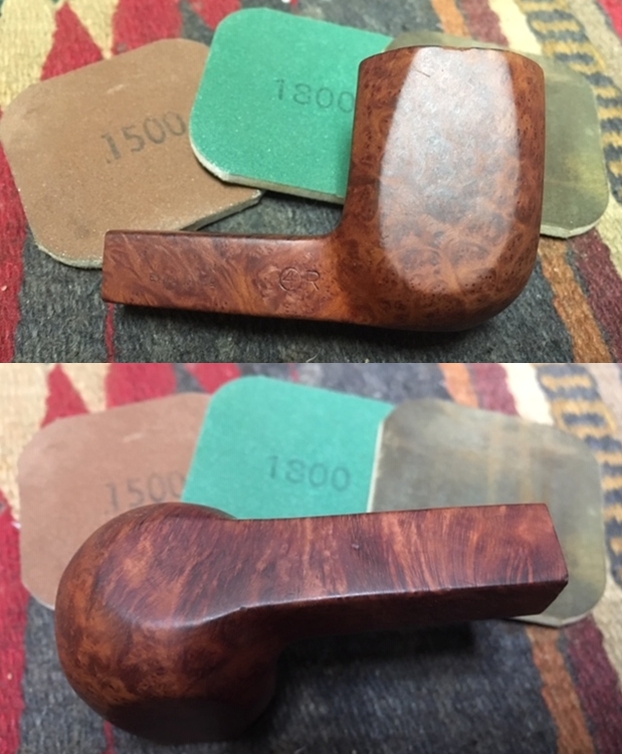 I started my refurbing work by addressing the darkening on the rim top and inner edge. I first sanded the inner edge with a folded piece of 220 grit sandpaper. I then lightly sanded the rim top with a worn piece of 220 grit sandpaper. I find that using a bit more tired piece of sandpaper works wonders on the dark edge without scratching the rim surface like a new piece. I followed that by wet sanding it with 1500-2400 grit micromesh. I sanded the rest of the pipe with the micromesh at the same time. I dry sanded it with 3200-12000 grit sanding pads. I wiped down the bowl after each pad with a damp cloth. The grain on the rim top began to shine through and the finish was in good condition under the darkened grain.
