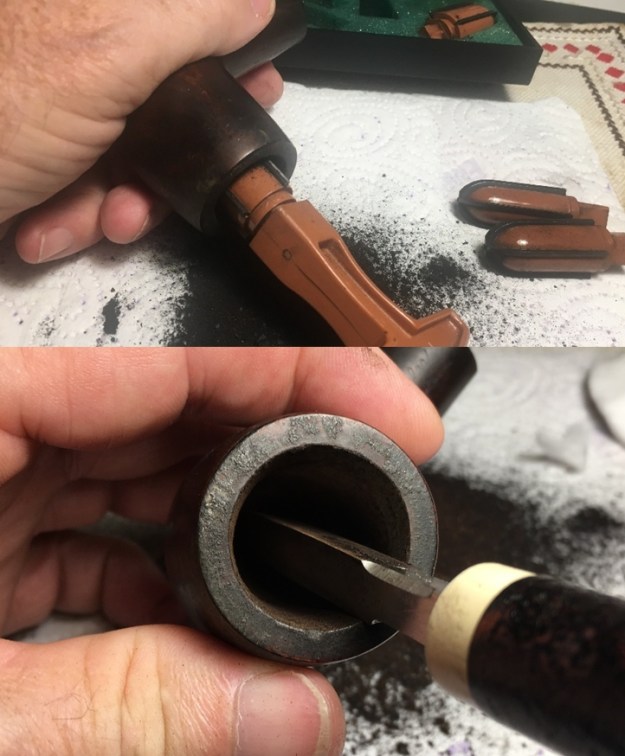 Turning now to the bowl, I begin by reaming the chamber. There is heavy cake in the chamber tightens as it descends in the chamber. Using the Pipnet Reaming Kit, I start with the smallest of the 4 available blade heads. After putting some paper towel on the table, I go to work. I use 3 blade heads of the 4 and then transition to the Savinelli Fitsall Pipe Tool. With the Fitsall tool I continue scraping the chamber wall and fine-tuning the reaming and reaching to the difficult angles. Then, wrapping 240 grade paper around a Sharpie Pen, I sand the chamber removing more carbon and revealing fresh briar. To complete the chamber cleanup, I wipe it with a cotton pad and alcohol to clear the carbon dust. With the carbon cake cleared, an inspection of the chamber reveals no problems with cracks or heat fissures. The pictures show the progress.