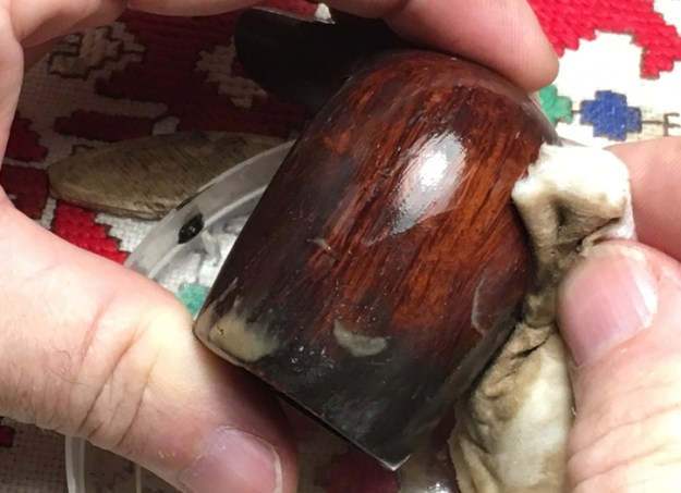 To preserve the patina in the old finish, I’m willing to allow some scratches and dents to pass as badges of this Stanwell Henley’s past walk in life. I did want to try raising some in an area where I identified a concentration of these. I take a picture to show a closeup of the area. I then take my wife’s iron (she always raises her eyebrows when I ask for permission and my response to her question regarding what use HER iron will be to the art of pipe restoration! 😊) and wet a rag with tap water and place the rag over the briar area to be addressed. After the iron is heated, I place the iron over the rag which heats both water and wood creating a steaming effect on the dents and scratches. The effect of the heating and moisture causes the briar to absorb the moisture and expand, helping to close the wounds. This technique helped, but there remain some badges of the past for the Henley Special!
