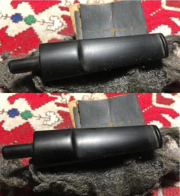 Next, using micromesh pads 1500 to 2400, I wet sand the stem. I follow by dry sanding using pads 3200 to 4000 and 6000 to 12000. Between each set of 3 pads, I apply a coat of Obsidian Oil to the stem to revitalize the vulcanite. The pictures show the progress of restoring that glossy pop. I like it!