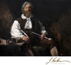 He poses with a tavern pipe. This type of pipe was a communal pipe used in pubs in the 18th century. After each use, the pipe stem was cut away then replaced on the mantel for the next user. I chose a color scheme appropriate to the time period and drew inspiration from Rembrandt’s work in the direct gaze, dark background and loose handling of paint, especially in the clothing….