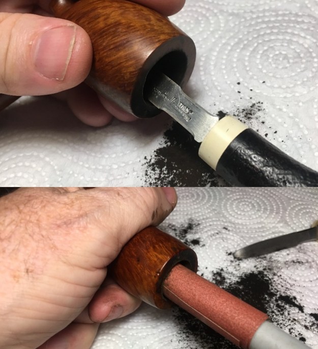 I begin the cleaning process of the stummel by reaming the chamber. Because of the small, tapering chamber, I do not use my regular Pipnet Ream kit but instead go directly to using the Savinelli Fitsall tool and it does a stellar job. It reaches very easily to the difficult areas at the floor of the chamber and negotiates well the angle of the conical bowl. Using 240 grit paper around a Sharpie Pen, I sand the chamber to clean further the carbon cake. Finally, I clean the carbon dust using a cotton pad wetted with isopropyl 95%. After inspecting the chamber, I see no heating problems with cracks or fissures. I move on.
