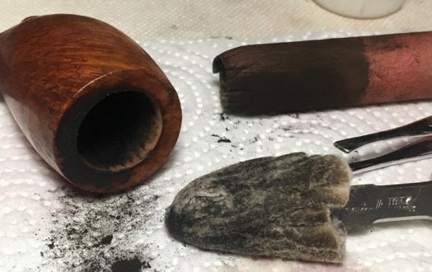 The next morning the soak has done the expected job. The kosher salt and cotton wick are soiled after drawing out oils and tars from the internal cavity. I empty the bowl of salt, wipe the chamber with a paper towel, use a shank brush and blow through the mortise to remove any left-over salt crystals. To make sure the cleaning is complete, I expend a few more cotton buds and pipe cleaners and find great results. A refreshed pipe for the curator! Moving on!