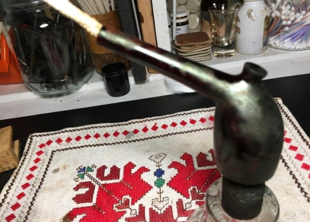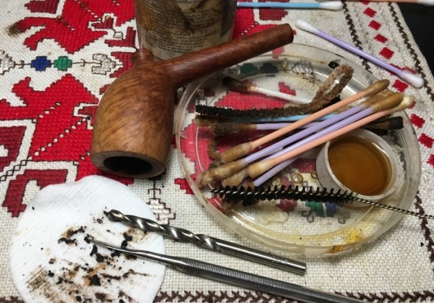 To begin the restoration, using pipe cleaners dipped in isopropyl 95% and long shank brushes, I clean the internal airway of the pencil stem. It was dirty.