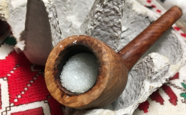 With the workday ending, I continue the cleaning of the internals using a kosher salt and alcohol bath. I first stretch and twist a cotton ball to form a ‘mortise wick’ that I insert into the long, narrow shank of the Cutty. I use a slender painter’s brush to help force the cotton down the airway. I then situate the stummel in an egg carton and fill the bowl with kosher salt. Kosher salt doesn’t leave an aftertaste like iodized salt. I then fill the bowl with isopropyl 95% until is surfaces over the salt. I wait a few minutes as the alcohol recedes and then top it off. I turn out the light to let the salt and alcohol do it job through the night.