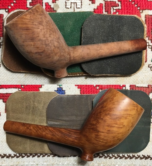 After placing 240 grade paper on a chopping board, with the stummel inverted, I rotate the stummel over the paper several times to top the stummel. I check to make sure I’m remaining true and finish with a few more rotations.