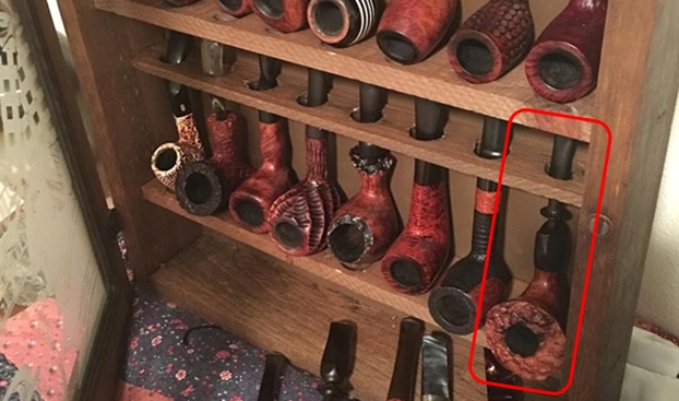 The next pipe in the queue is yet another interesting pipe from the Michigan lot – a Custom Carved Malaga Freehand with plateau on the rim top and horn(?) shank extension. The entire pipe had some beautiful straight grain around the bowl and birdseye grain on bottom and top of the shank. The plateau rim top had some darkening but was otherwise in good condition. The pipe has a natural oil finish that really makes the grain on the pipe pop. The carver did a great job utilizing the block of briar to maximize the grain. The pipe is stamped on the underside of the shank. It reads “MALAGA” (over) Custom Carved. The stem is vulcanite and has no marking or stamping on it. It is a typical freehand style saddle stem. This is another nice looking piece much like the rest of those in this 21 pipe Michigan pipe lot. The Malaga Custom Carved Freehand I am working on is shown on the second shelf of the rack pictured below. It is the first pipe from the right and I put a red box around it to make it easy to identify.