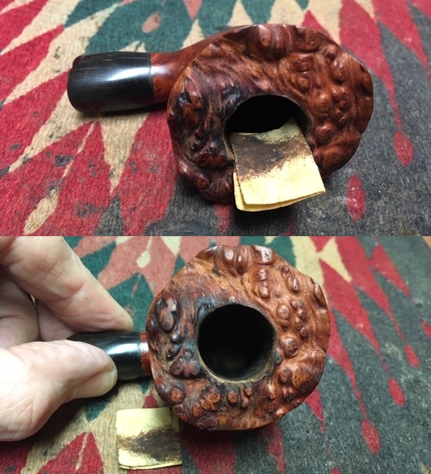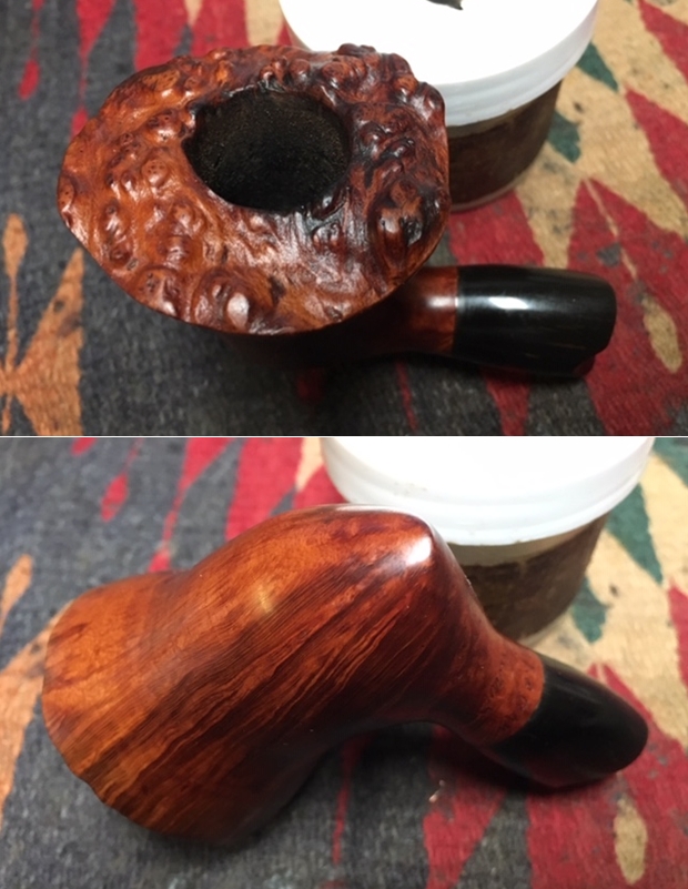 He also took a photo of the right and underside of the bowl and shank to show the straight grain around the bowl. The finish is very dirty but the grain is visible in the photo.