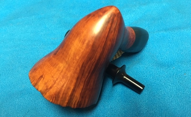 Now with both parts of the pipe finished, I polished stem with Blue Diamond polish on the buffing wheel. I gave the bowl multiple and the stem multiple coats of carnauba wax. I buffed the pipe with a clean buffing pad to raise the shine. I hand buffed it with a microfiber cloth to deepen the shine. The pipe polished up pretty nicely. The grain came alive with the buffing. The rich oil finish on the briar works well with the horn shank extension and the polished black vulcanite stem. The finished pipe is a beauty and feels great in the hand. Have a look at it with the photos below. The dimensions are Length: 6 inches, Height: 2 1/2 inches, Outside diameter of the bowl: 2 inches, Chamber diameter: 3/4 of an inch. This one will be going on the rebornpipes store shortly and can be added to your collection. Thanks for walking through the restoration with me on this uniquely carved Malaga Custom Carved Freehand.