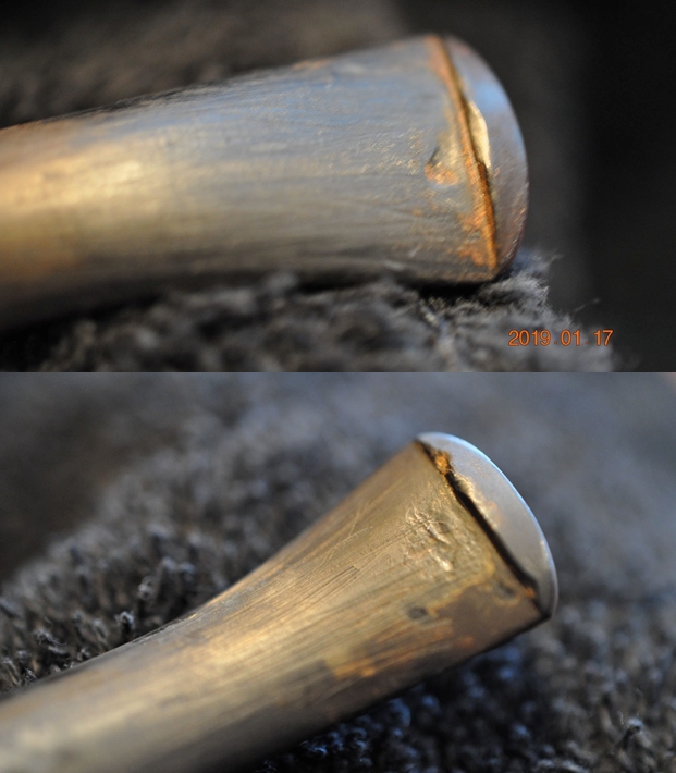 The next two photos show the stem surface. They show the tooth marks and chatter on both sides near the button. There are also some marks on the sharp edge of the button. The stem is dirty and is covered in scratches.