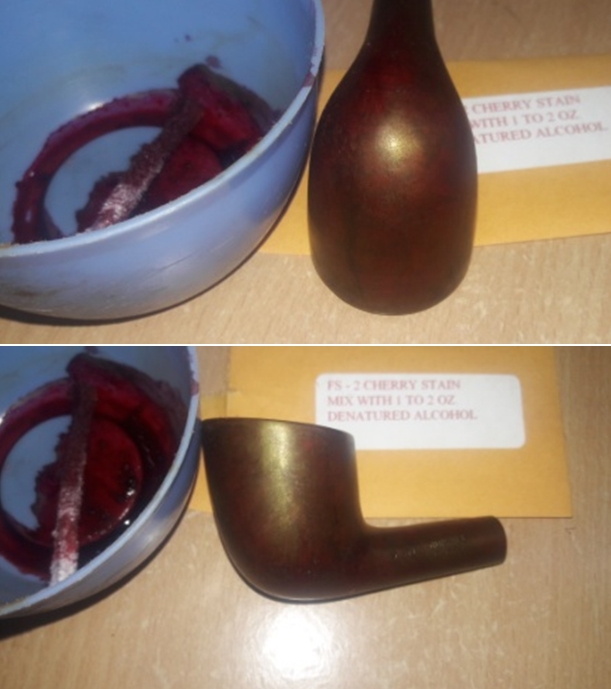 I kept the stem aside to let the stem absorb the oil and turn my attention towards the stummel. I decided to stain the stummel in cherry red stain which was the original stain true to the Bruyere line of Dunhill pipes. I use the powder variety of stain and mix it with 99% isopropyl alcohol. I heated the stummel surface with a heat gun and applied the stain with a folded pipe cleaner. As I paint the stummel with stain over sections at a time, I burn the dye using a Bic lighter that combusts the alcohol in the aniline dye and sets the dye pigmentation in the wood. After fully saturating the stummel and covering the whole surface, including the rim top, I set the stummel aside to rest for several hours.