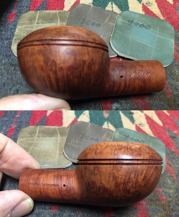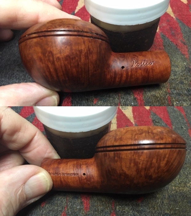 I took photos of the stamping on the shank sides. The left side read Vottis in script looking like it was almost engraved. The right side read Genuine Algerian Briar.