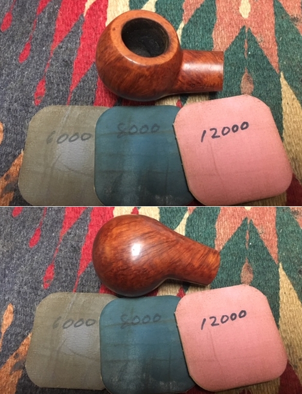 I polished the rim top and the rest of the briar with micromesh sanding pads – wetsanding it with 1500-2400 grit pads and dry sanding it with 3200-12000 grit pads. I wiped the bowl down with a damp cloth after each pad to remove the sanding debris. After the final sanding pad I hand buffed it with a cotton cloth to raise a shine.