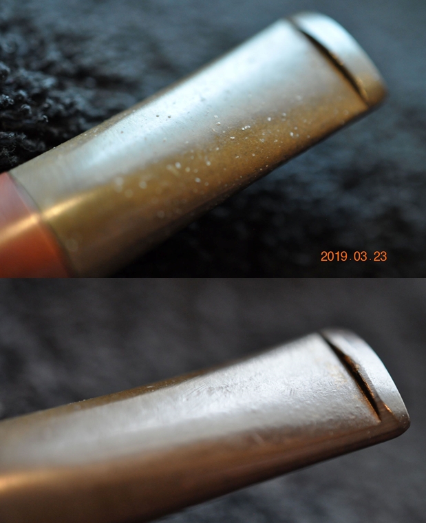 The next two photos show the stem surface. They show the pitting and oxidation on the surface of both sides of the stem. There are also some nicks on the outer edge of the button. The third photo below shows the stinger that is in the tenon once the stem is removed from the shank.