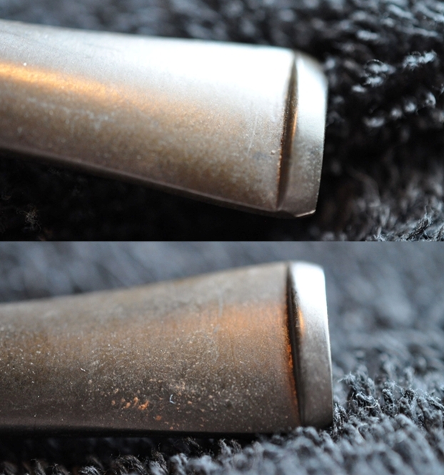 The next two photos show the stem surface. They show the oxidation and the chatter on both sides near the button. There is also some wear on the button edges. The most significant issue that will need to be dealt with is the crack in the button edge and into the stem on the underside.