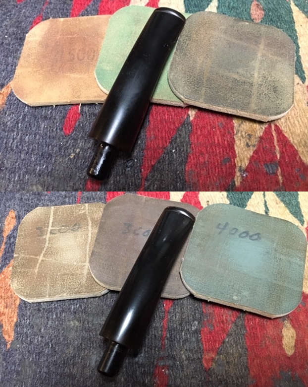 I used a folded piece of 240 grit sandpaper to address the tooth chatter and blend the repair into the surface of the stem. Once the surface was smooth I sanded out the scratch marks and started the polishing of the stem with a folded piece of 400 grit sandpaper. I wiped the stem down with Obsidian Oil.