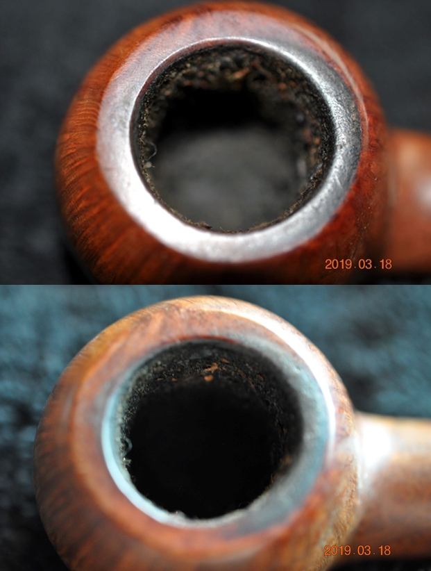 Jeff took 2 close-up photos of the bowl and rim at different exposures to capture the condition of the pipe when it arrived. The rim top had some light lava and some darkening on the back rim top. The bowl had a cake that was quite thick but also a lot of tobacco debris stuck to the walls.