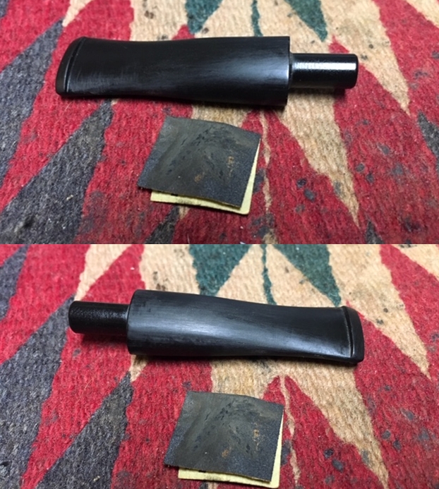 I then sanded the band surface with micromesh sanding pads. I started with 1800 grit and then polished the end with each successive grit of micromesh from 2400-12,000 (Photos 34 – 35). By the end of the sanding and polishing process the surface of the band is flat and relatively smooth. I was able to remove many of the dents with the repeated heating and pressing against the steel surface. In Photo 35 you can still see the few remaining dents that I was not able to remove. The overall look is greatly improved and with the stem in place the pipe looks as it supposed to in terms of the gap between the end cap and the stem.