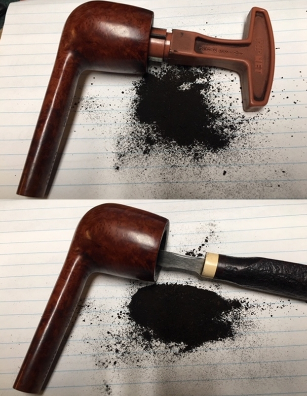 I began the restoration, as has become a natural rhythm, by cleaning the internals of the pipe. I reamed the bowl with a PipNet reamer. It is pictured in Photo 7 as a T handle and 4 different cutting heads. I generally start with the smallest head or the one that fits most easily into the bowl. I am careful to hold the head straight up and down while I am working on the bowl as it is easy to misalign the reamer and cut the bowl out of round. I work from the smallest head that fits until I get to the one that takes the cake back until the briar is bare. When I am working on a pipe that I intend to keep for myself I like to remove the cake and start over. Photos 8 – 10 show the process of the reaming with the PipNet and the finished bowl after reaming.