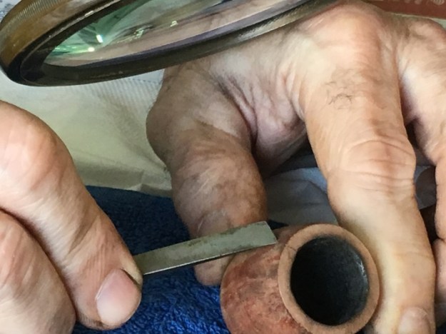 Jeff continues cleaning the BBB stummel with more Murphy’s Soap and gently scrapes the lava buildup on the stummel surface just over the rim.
