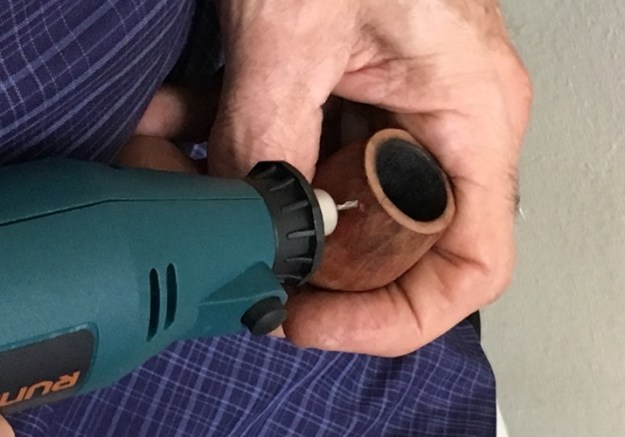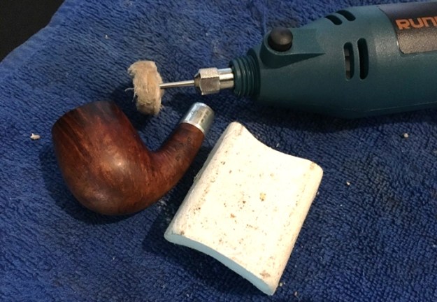 With the stummel cleaned, I finally get the nod from the project manager to put down my iPhone (actually, Paresh takes over the picture taking) and pull out the Dremel and to begin the fine polishing phase. I use White Diamond compound with a cotton cloth buffing wheel mounted with the speed set at about 40% of full power and apply the compound.