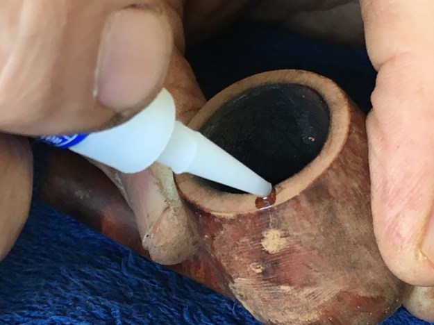 With the main crack glued and briar dust applied, the secondary crack receives a spot drop of the thin CA glue as well to create a strengthened reinforcement.