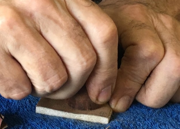 Following the topping, again using the 1500 micromesh pad, Steve sands both repair areas on the stummel surface as well as topping the stummel with the micromesh pad. This smooths and blends the repair area well with little impact on the ancient briar’s patina.