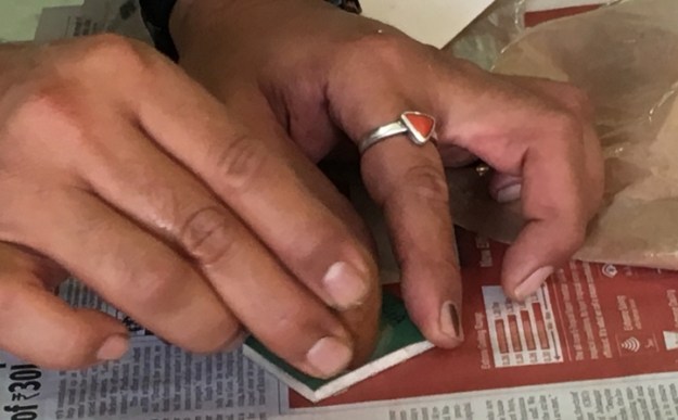 Paresh tackles this project by using a dry powdered silver cleaner that he has available in India. I had never seen anything like it before and watched with interest as Paresh pinched the powder and applied it to the band and rubbed the powder in the metal.