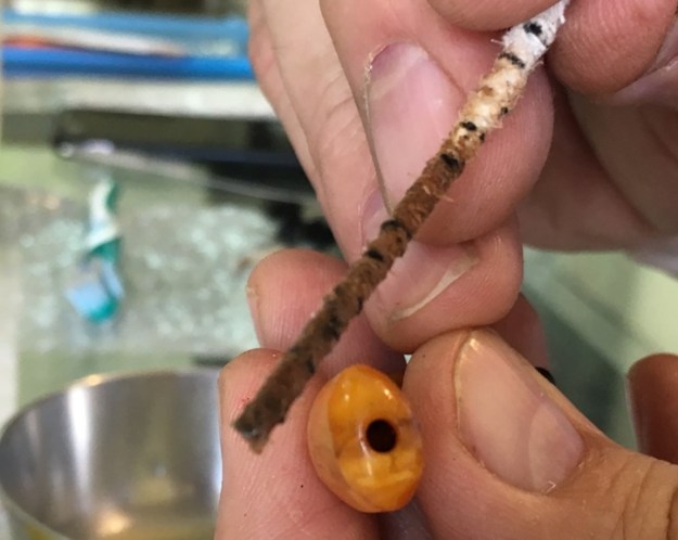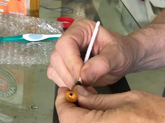 Now armed with a natural cleanser, lemon juice, Jeff continues the cleaning of the amber stem’s airway.